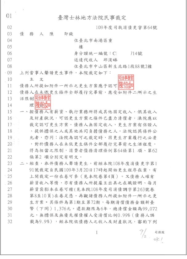 後來陳先生為躲避債務催收,辭掉了工作也搬離舊居地。因逢濟會在家人建議下找到本會。經本會了解當事人狀況後提出更生處理方案! 當下陳先生心想只能死馬當活馬醫了!!