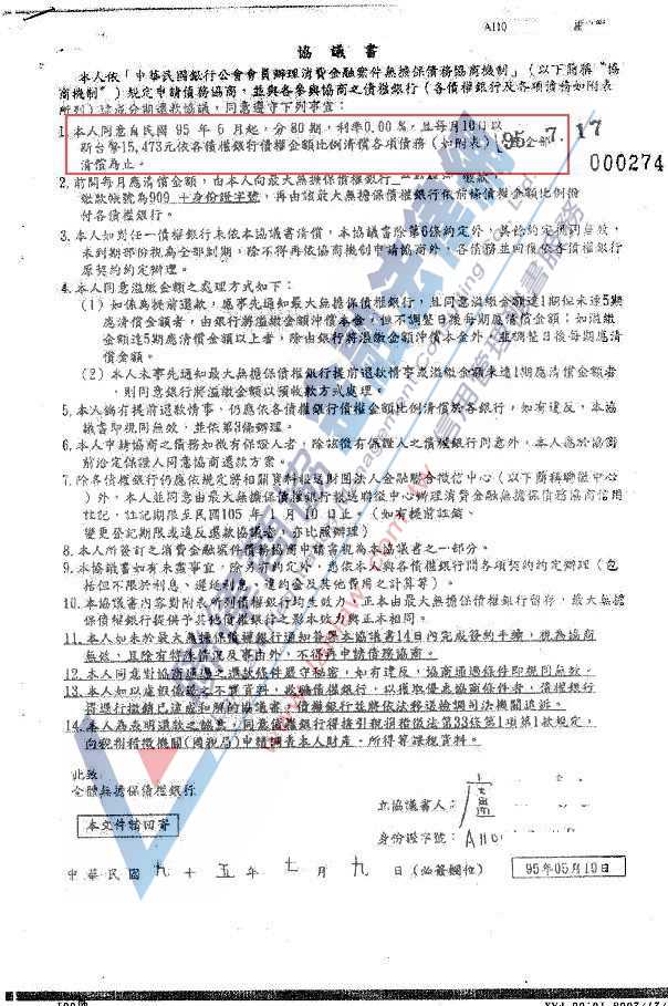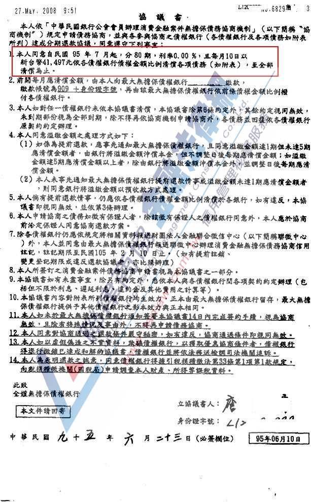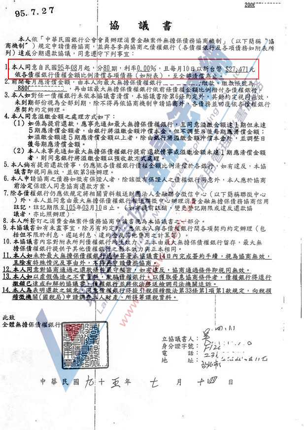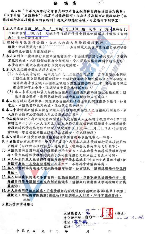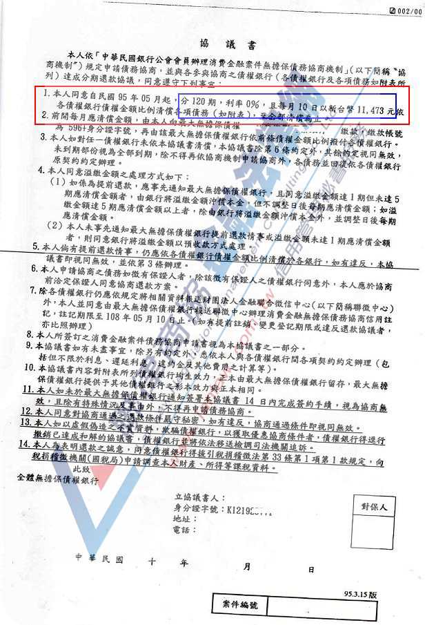 2023-10-10 新北市-翁小姐-公會協商120期0%利率 新北市-翁小姐因老公無所事事到處借錢欠債,與銀行大量借款最後因無法償還走投無路只能尋求本協會協助,最後協商結果為120期0%利率,得以舒緩翁小姐債務上的利息壓力。有卡債協商需求歡迎與我們聯繫~ more